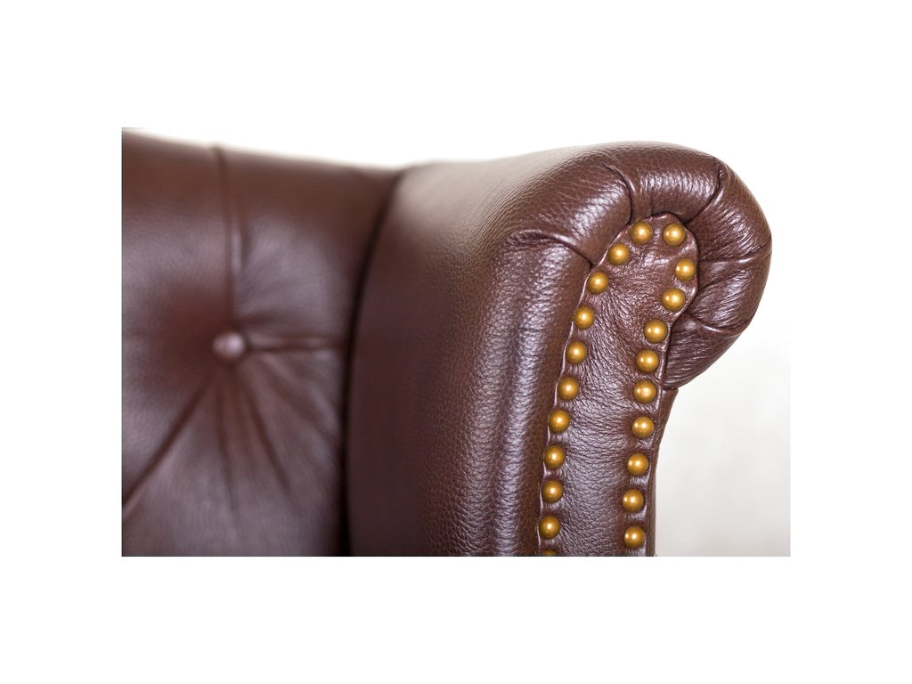 Коричневый кожаный диван из букового массива располагается на четырех коротких ножках черного цвета: прямых задних и эффектно изогнутых – передних. Спинка с волнообразным верхом слегка загибается по бокам и соединяется с мягкими подлокотниками. Поверхность дивана украшена стяжкой и декоративными заклепками по периметру. Глубина места для сидения 64 см. Сборка не требуется. Вес 47 кг.