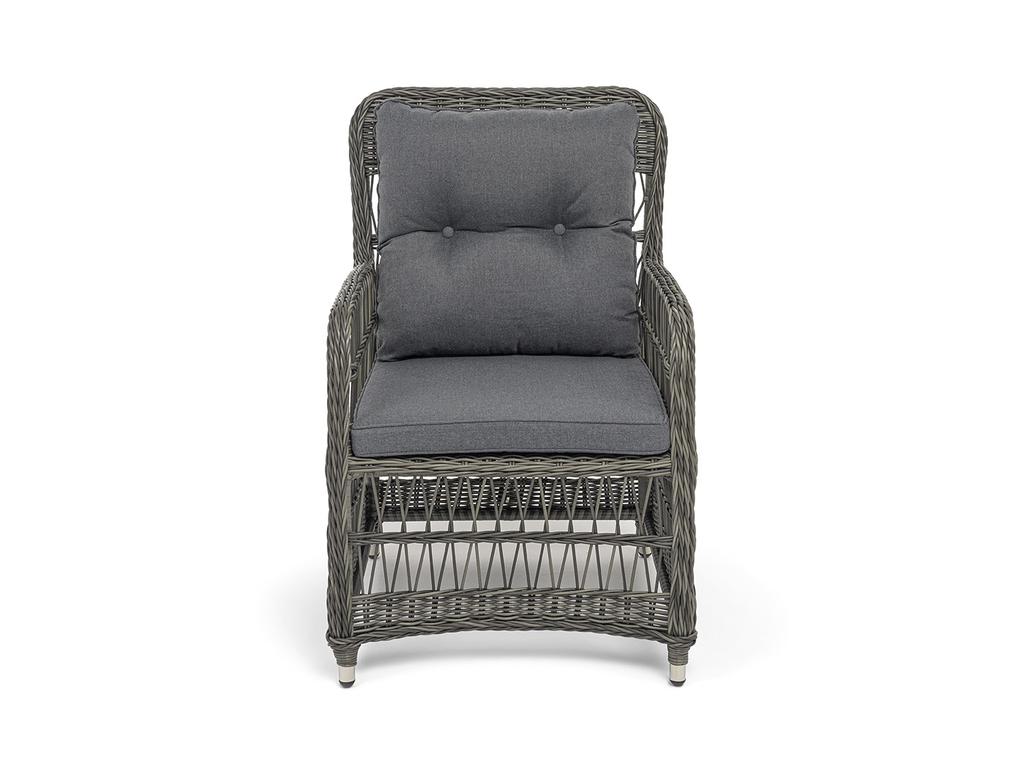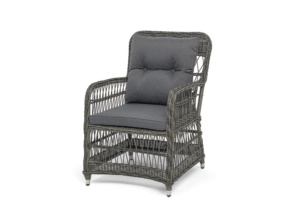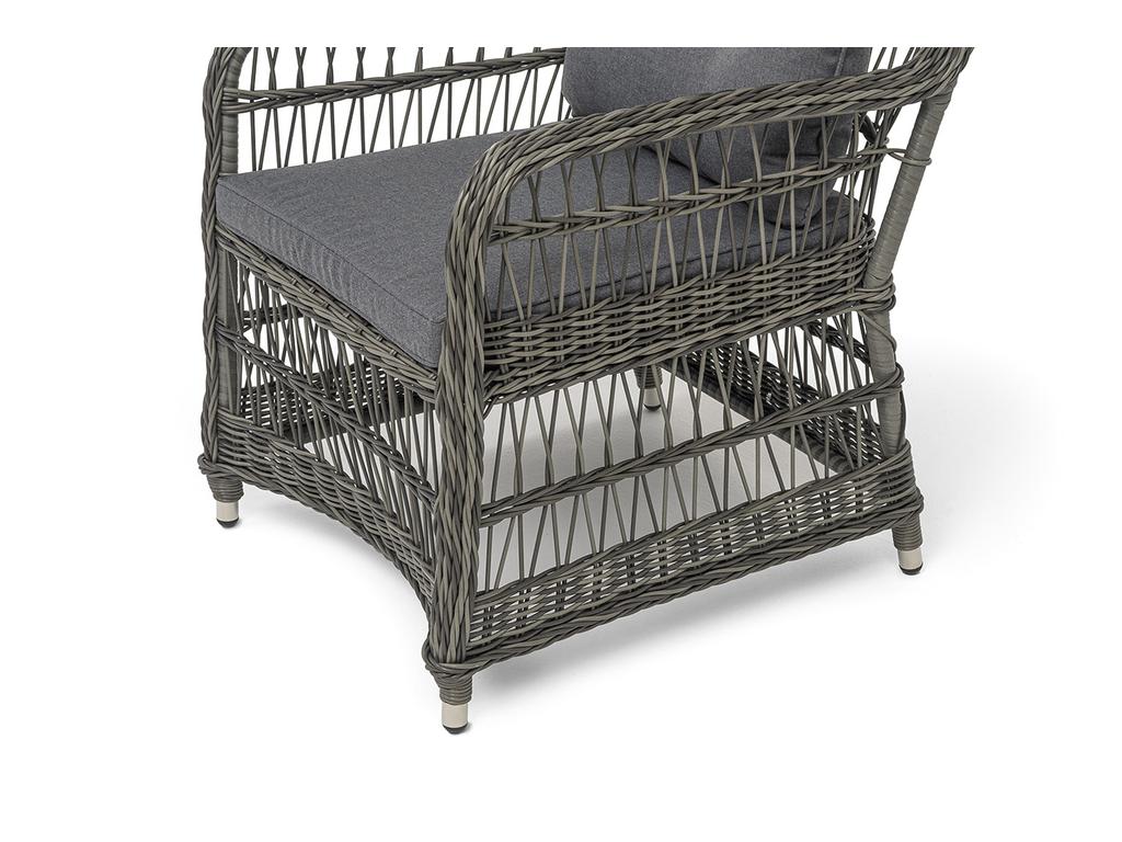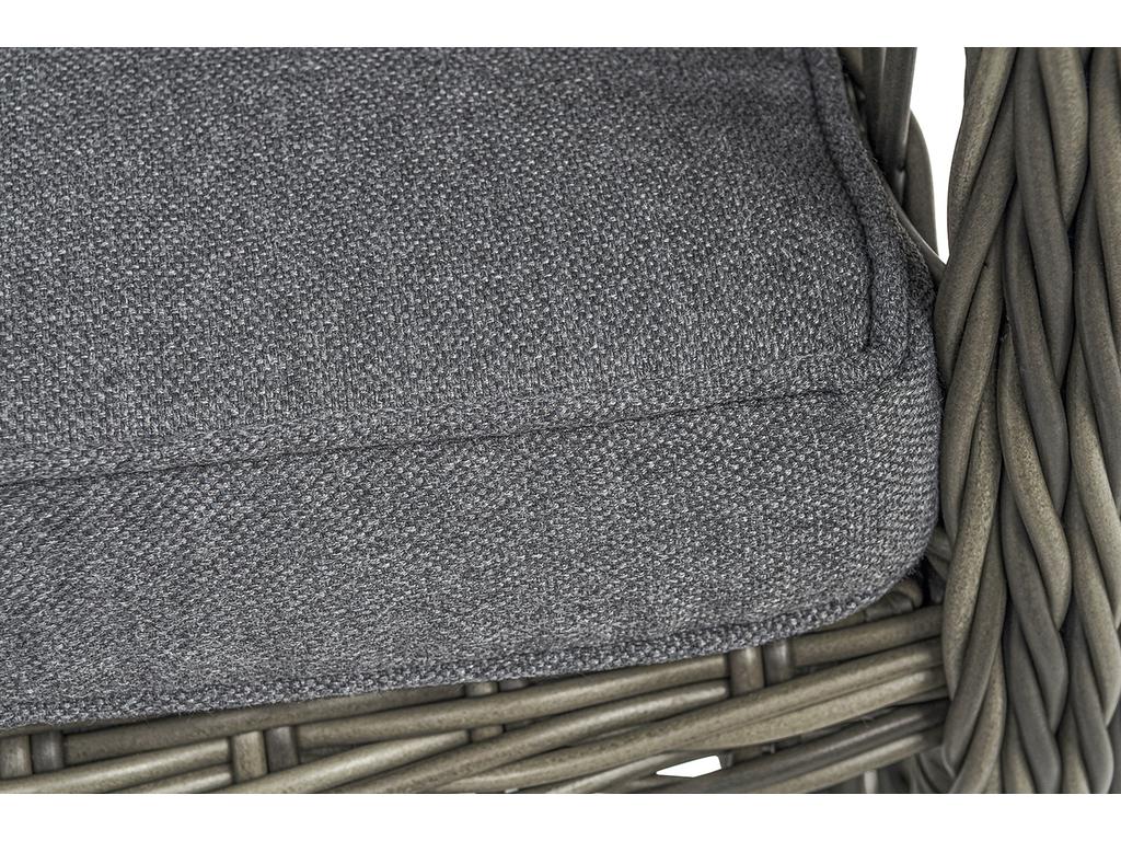 Кресло «Цесена» имеет практичные подлокотники для удобного размещения во время отдыха. Алюминиевый каркас находится в основе мебели. Он характеризуется устойчивостью и высокой прочностью. Задекорирован ручной круглой оплеткой, которая сделана из искусственного ротанга. Представлена в графитовом оттенке. Садовое кресло располагает двумя мягкими подушками, которые идут в комплекте. Они выполнены в сером цвете. Полиэстер высокого качества используется при пошиве тканевых изделий. Ткань обрабатывается влагоотталкивающей пропиткой. Вес 14,8 кг.