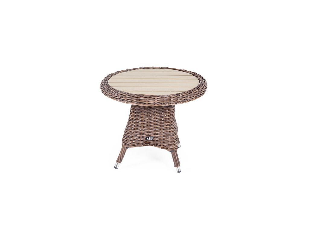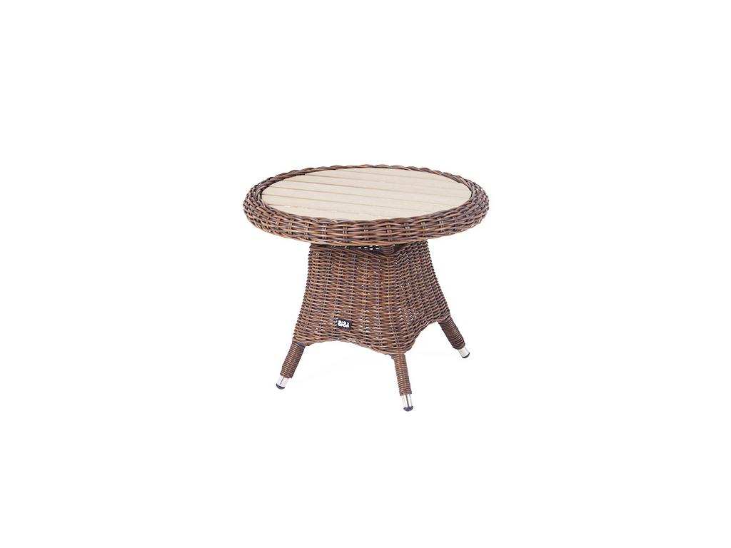 Столик «Равенна» может использоваться как в роли кофейного, так и в качестве детского обеденного стола, в комплект к которому подходят детские кресла из этой серии. Столик располагает прочным каркасом, который изготовлен из качественного алюминия, отвечающий за надежное расположение конструкции. Весь каркас оплетен вручную круглым искусственным ротангом коричневого цвета. Рабочая поверхность столика выполнена из древесно-полимерного композита (ДПК). Материал обладает высокой износостойкостью и прочностью в ходе эксплуатации. Вес 7,5 кг.